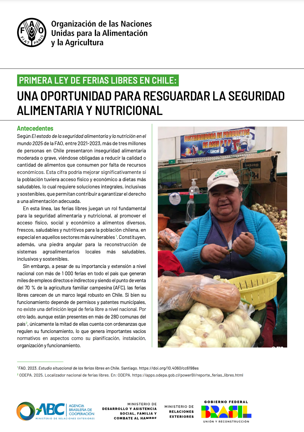 Las ferias libres son esenciales para garantizar el derecho a una alimentación adecuada en Chile. Pese a su importancia para el acceso a alimentos frescos y saludables, no existe una legislación nacional que regule su funcionamiento. Esta publicación presenta el proyecto de ley que busca reconocer, proteger y fortalecer a las ferias libres como pilares de la seguridad alimentaria y el desarrollo local.