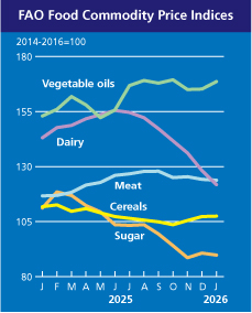 » The FAO Food Price Index* (FFPI) averaged 123.9 points in January 2026, down 0.5 points (0.4 percent) from December. Declines in the price indices for dairy products, meat and sugar more than offset increases in cereals and vegetable oil, marking the fifth consecutive monthly decline of the index. The FFPI stood 0.8 points (0.6 percent) below its level one year ago and as much as 36.4 points (22.7 percent) down from the peak reached in March 2022.