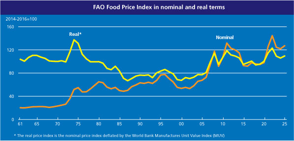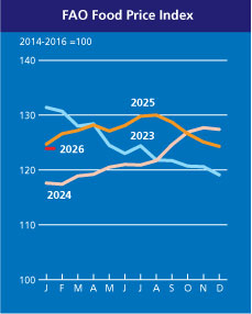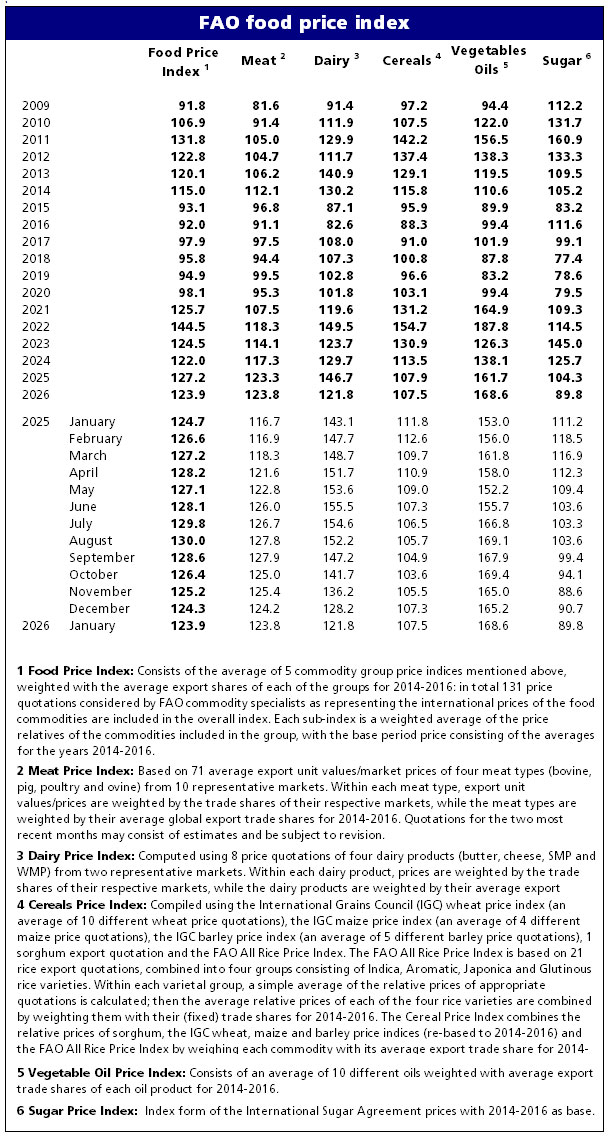» The FAO Food Price Index* (FFPI) averaged 123.9 points in January 2026, down 0.5 points (0.4 percent) from December. Declines in the price indices for dairy products, meat and sugar more than offset increases in cereals and vegetable oil, marking the fifth consecutive monthly decline of the index. The FFPI stood 0.8 points (0.6 percent) below its level one year ago and as much as 36.4 points (22.7 percent) down from the peak reached in March 2022.