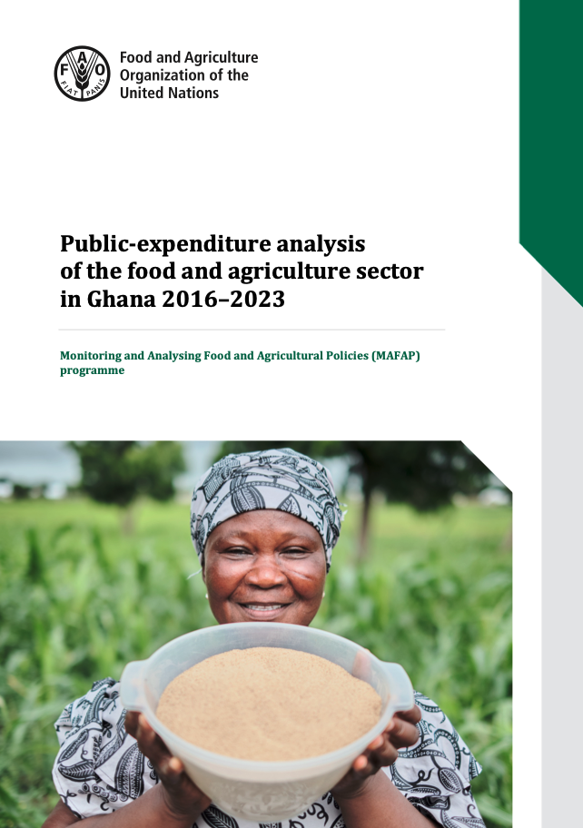 This report analyses Ghana’s public expenditure on food and agriculture from 2016 to 2023 using FAO MAFAP indicators. Nominal agricultural spending grew by an average of 33 percent annually, yet real spending and its share of total public expenditure declined. Input subsidies and training absorbed more of the resources, while extension services, agro-processing, storage, and consumer support received limited funding. Crops attracted the largest share, highlighting the need to improve efficiency.